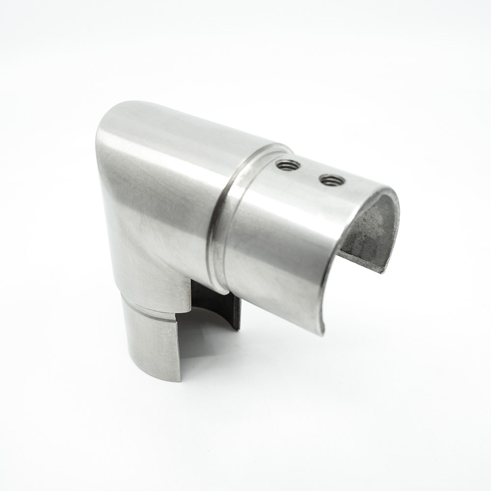 The 316 Stainless Steel 90°-Down Connector for 1.67″ x 1.67″ Round Top Cap Rail for Glass Railing from West Railings is the connector needed to connect two runs of round top cap rails together on a 90-degree angle. As well as on a vertical axis when the top cap rail is attached on the vertical edge of the panel. One common situation where this connector is needed is to connect a top cap rail from a staircase to a landing on the same line.The discrepancy of height (34″-38″ on the stairs to at least 42″ on the landing) will require this connector plus a 316 Stainless Steel Adjustable Connector UP for 1.67″ x 1.67″ Round Top Cap Rail for Glass Railing (sold separately).
